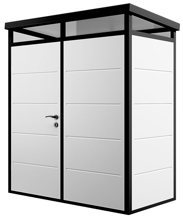 המחסן כולל חלונות סקיילייט מזכוכית מחוסמת, דלת איכותית עם מנעול צילינדר ורצפה פנימית מוגבהת